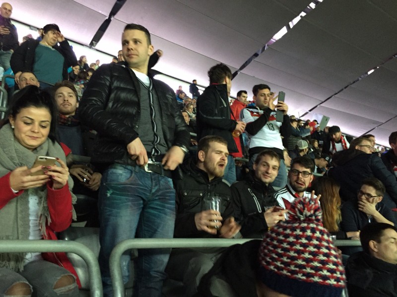 Um 17.00 Uhr ging’s mit dem Bus in Richtung München. Kurz vor der Arena bekamen wird den Münchner Verkehr zu spüren und der Stau war gefühltermaßen endlos. Als wir dann eigentlich pünktlich ankamen stellte sich uns noch die Maßen an Leuten in den Weg, die vor den Sicherheitskontrollen warteten. Nachdem wir dann den Eingang passiert hatten, war das Spiel bereits fünf Minuten im Gange 🙁