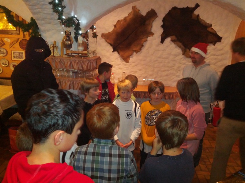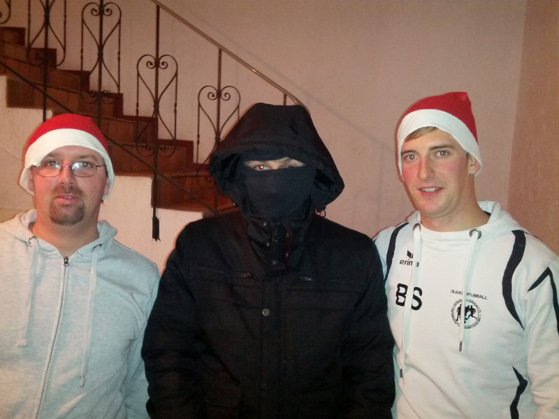 Im Anschluss an das Essen kam es zur Bescherung. Da der Nikolaus heuer zu viele andere Aufträge hatte, schlüpften in diesem Jahr die drei Trainer Frank Schreiner, Florian Klante und Björn Strahberger in die Rolle des Moralpredigers. Marcel Friedl übernahm die Rolle des Grampus und setzte seine Rute ein, wenn es doch einmal nötig war.
